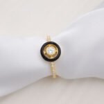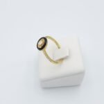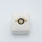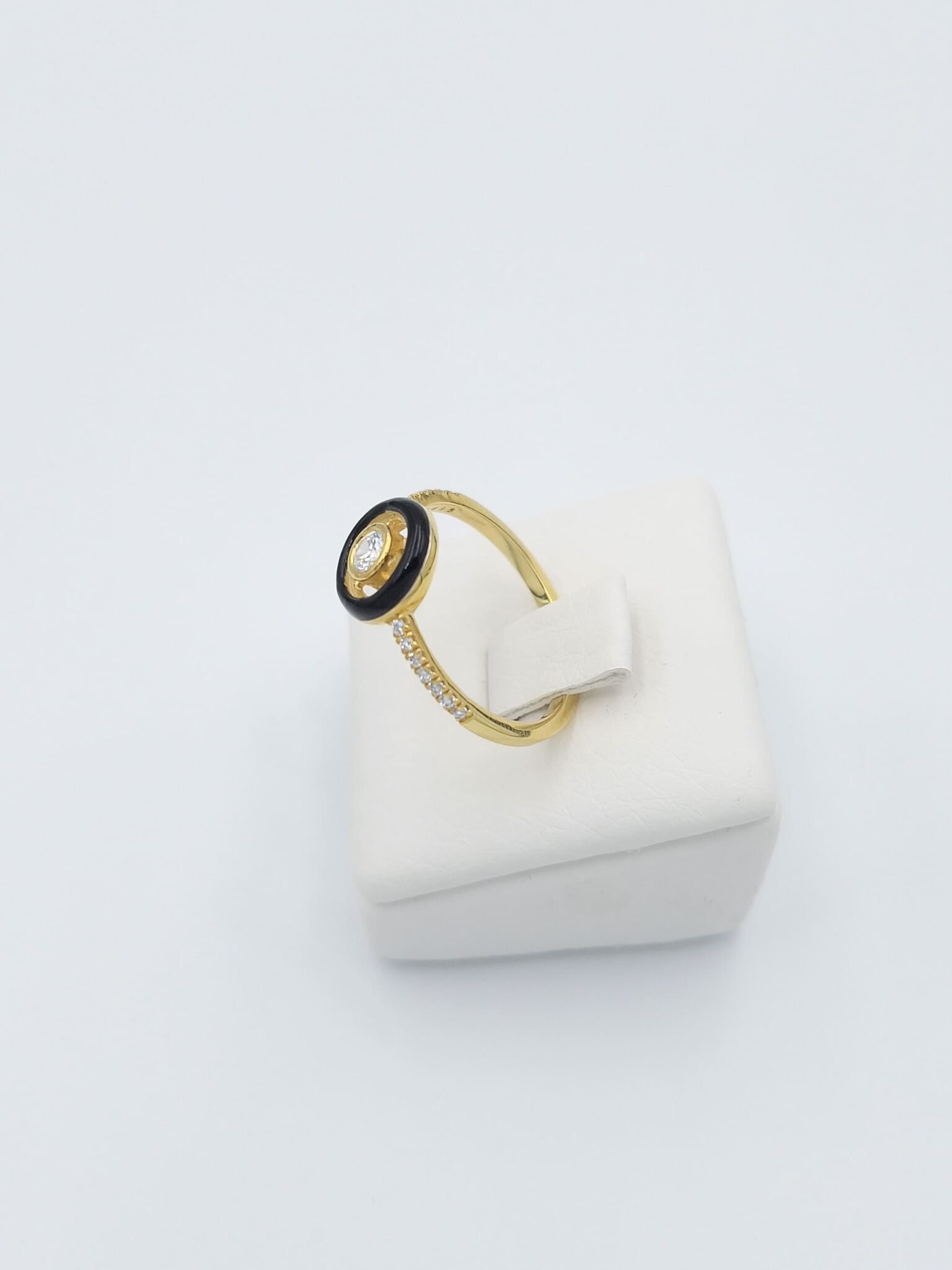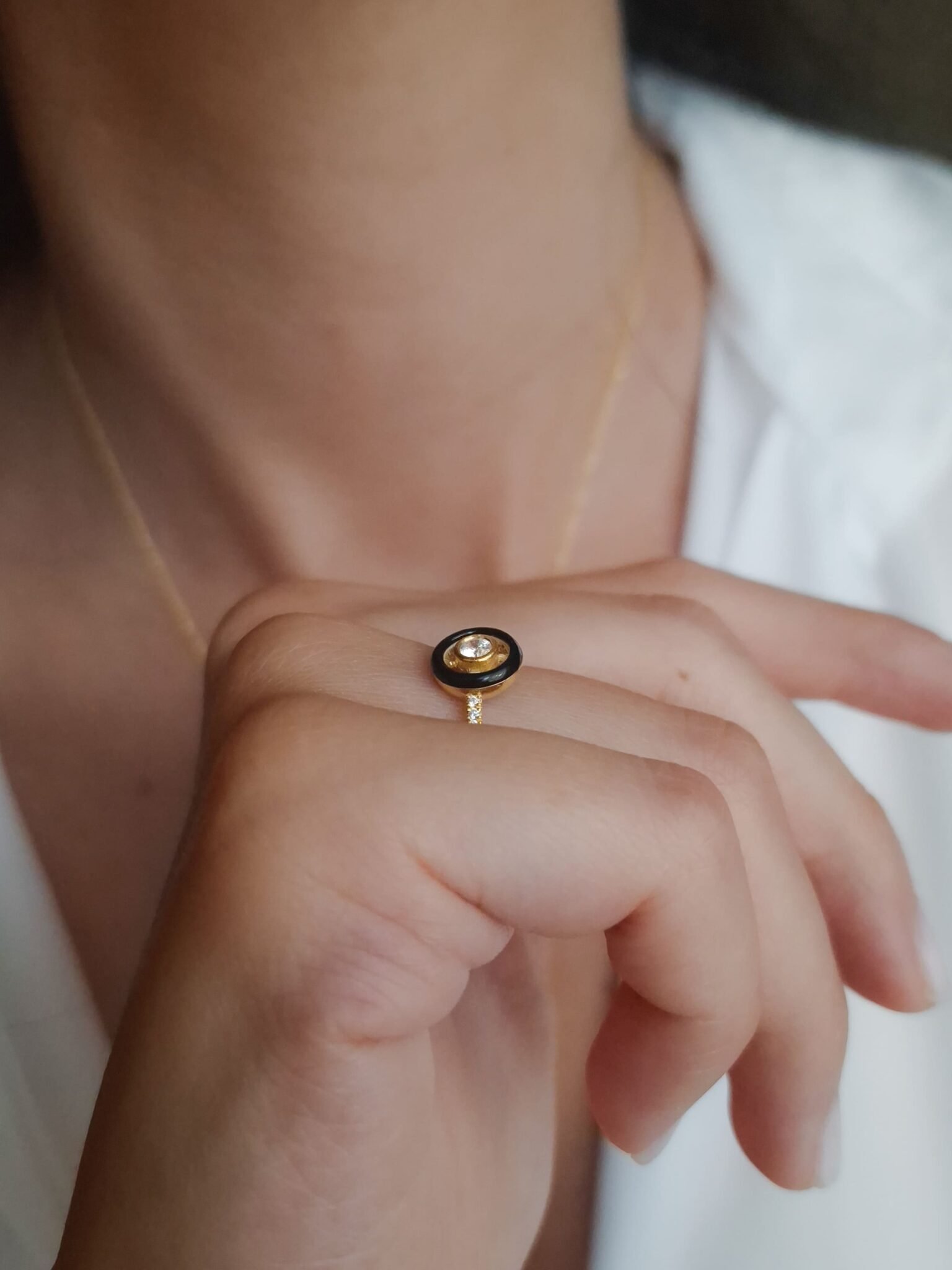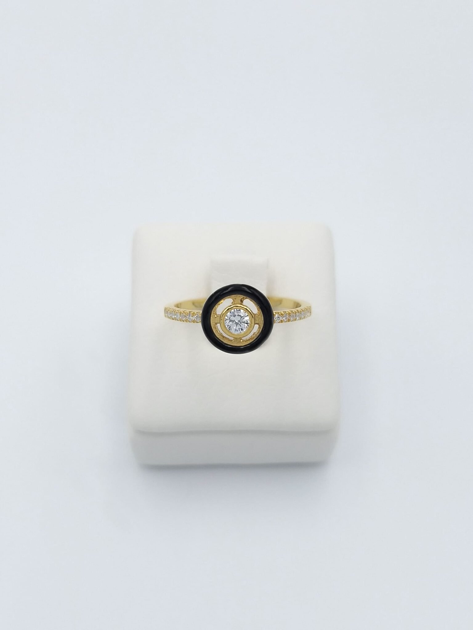 Ένα κομψό δαχτυλίδι που συνδυάζει πολυτέλεια και μοντέρνο στυλ. Στο κέντρο του δεσπόζει μια λαμπερή πέτρα που τραβά όλα τα βλέμματα. Το σμάλτο σε μαύρο χρώμα γύρω προσθέτει φρεσκάδα και μοναδικό χαρακτήρα.