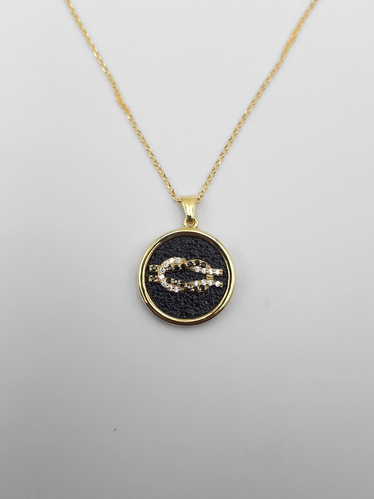 Είναι κατασκευασμένο από ασήμι 925 με επιχρύσωση, ενώ το περίτεχνο μοτίβο του κόμβου ξεχωρίζει πάνω σε μαύρο φόντο νανοκεραμικού υλικού, δημιουργώντας μια εντυπωσιακή αντίθεση. Τα λαμπερά λευκά και μαύρα ζιρκόν που το πλαισιώνουν χαρίζουν εκλεπτυσμένη λάμψη και πολυτέλεια.