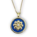 Ένα κομψό κολιέ εμπνευσμένο από την αρχαία ελληνική τέχνη. Το σχέδιο “Ρόδον” συμβολίζει την ομορφιά, την αγάπη και την αναγέννηση, ενώ το μπλε φόντο από νανοκεραμικό υλικό αναδεικνύει τις λαμπερές λεπτομέρειες του άνθους.