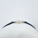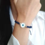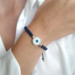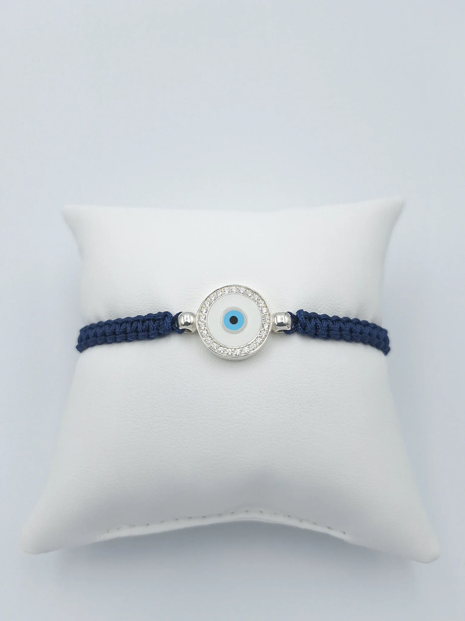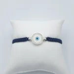 Ένα εντυπωσιακό μπλε μάτι σε μακραμέ βραχιόλι που συνδυάζει τον παραδοσιακό συμβολισμό με τη σύγχρονη κομψότητα. Είναι φτιαγμένο από ασήμι 925 και στο κέντρο του ξεχωρίζει ένα λαμπερό ματίβο ματιού, που σύμφωνα με την παράδοση αποτελεί σύμβολο και προστασία από την αρνητική ενέργεια.
