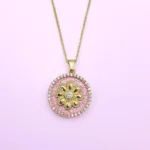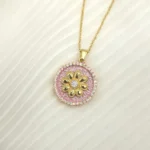 Ένα μοναδικό κόσμημα που ακτινοβολεί θηλυκότητα και κομψότητα. Το κυκλικό μενταγιόν είναι διακοσμημένο με ανάγλυφο λουλούδι σε χρυσή απόχρωση, το οποίο περιβάλλεται από ροζ φόντο με λαμπερές λευκές πέτρες περιμετρικά. Κατασκευασμένο από επιχρυσωμένο ασήμι 925, προσφέρει διαχρονική λάμψη και ρομαντική αύρα.