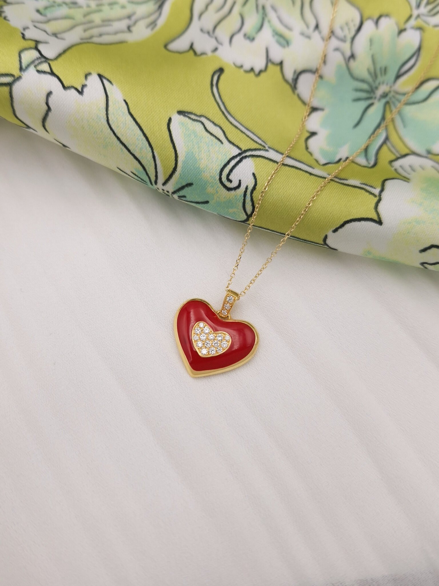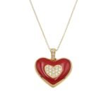 Αναδείξτε την αγάπη με αυτή τη χειροποίητη δημιουργία από Χρυσό 14 Καρατίων (585) υψηλής ποιότητας  σε κίτρινο χρυσό το παντατίφ μαζί με την αλυσίδα. Στολισμένο με λαμπερά ζιρκόνια τοποθετημένα στο χέρι και διακριτική λεπτομέρεια από Κόκκινο σμάλτο, αυτό το κόσμημα εκπέμπει πάθος, κομψότητα και διαχρονική ομορφιά.